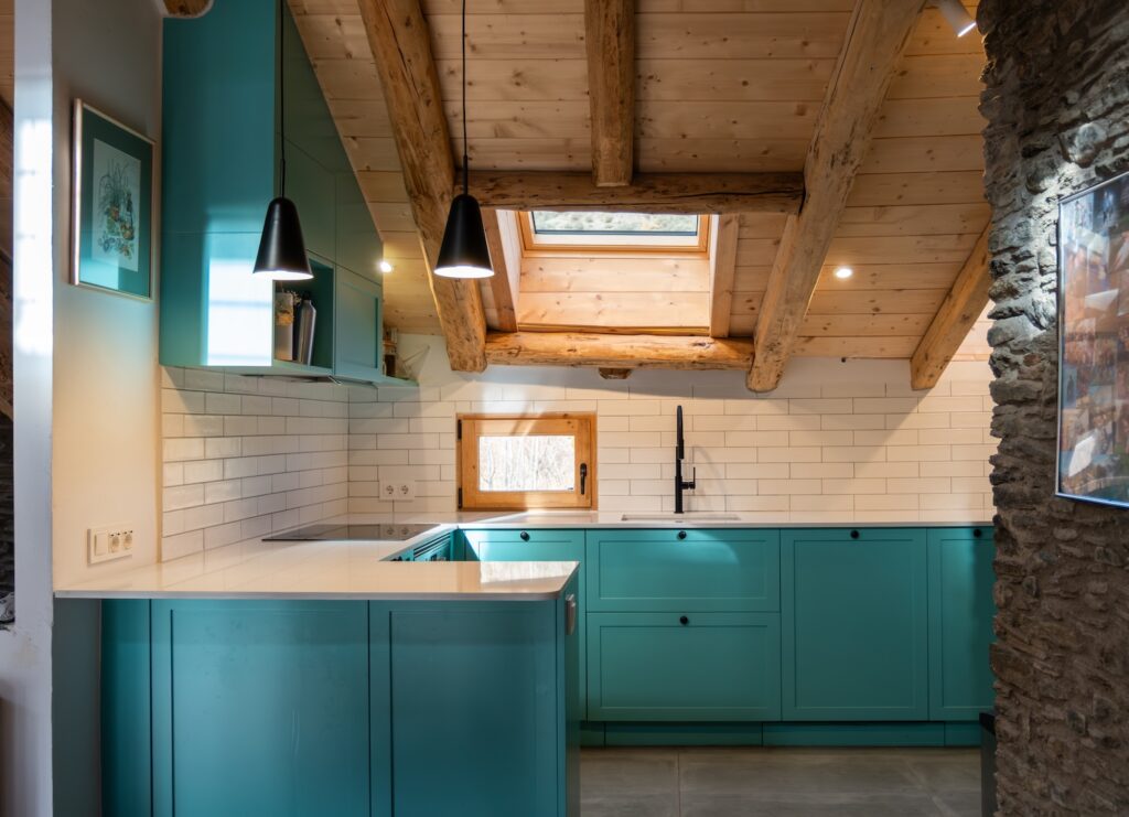 Una cocina con alma rústica y color único en el Pirineo