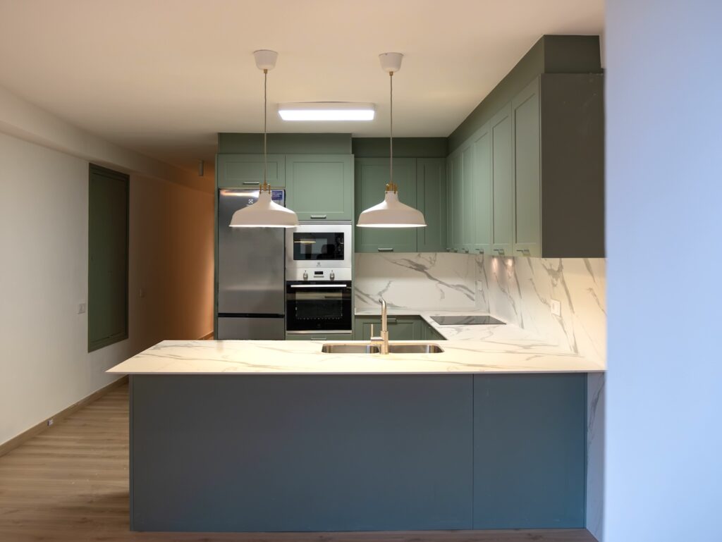 Cocina en “U” con un color verde único: funcionalidad y personalidad en equilibrio